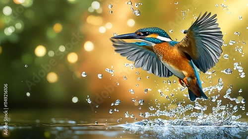 Kingfisher diving into water, catching fish, splashing, bokeh background.