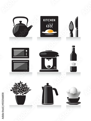 kitchen, appliance, utensil, teapot, coffee machine, microwave, oven, stove, blender, cutlery, egg, breakfast, food, drink, crockery, home, cooking, equipment, household, interior, design, black, white, graphic, illustration