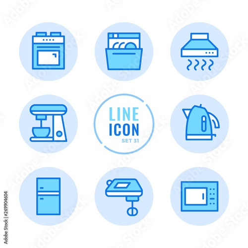 icon, kitchen, line, appliance, household, set, thin, home, food, equipment, electric, machine, cooking, stove, range, washing, dishwasher, pot, kettle, oven, microwave, cooker, mixer, blender, refrigerator, refrigerator, grinder, maker, washer, electronic, processor, hood, cooktop, vector, outline, signs, stroke, symbol, web, round, blue, colours, simple, graphic, design, element, lined, flat, illustration, linear