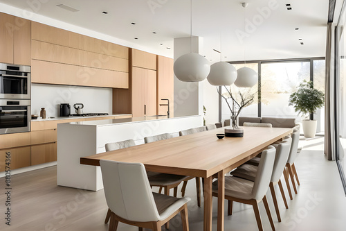 Kitchen features a modern minimalist interior design with an island, dining table, and chairs.