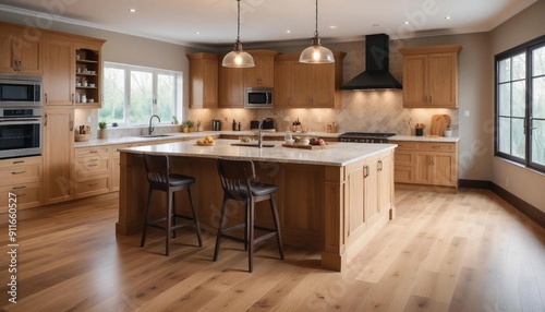 Kitchen interior in beautiful new luxury home with kitchen island and wooden floor,