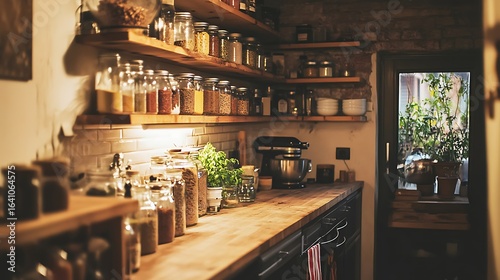 Kitchen Interior with Open Shelves and Jars
