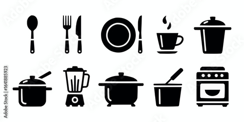 kitchen, utensil, appliance, icon, set, black, silhouette, culinary, cooking, design, vector, illustration, spoon, fork, knife, plate, cup, steam, pot, saucepan, blender, mixing bowl, oven, equipment, cookware, tableware, dinner, meal, food, chef, eatery, kitchen utensile