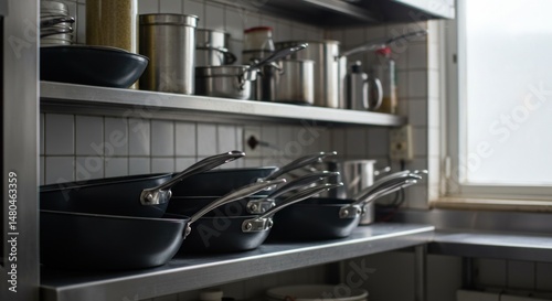 kitchen, eatery, cooking, cookware, pan, stainless steel, utensil, shelf, organised, clean, food, meal, preparation, kitchen utensile, professional, culinary, equipment, tool, modern, interior, indoor, storage, metal, detail, closeup, dining, serving, design, chef, stainless, silver, shiny, space, table