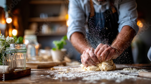 Kneading dough on wooden surface, hands covered in flour, creating rustic atmosphere filled with warm light and greenery
