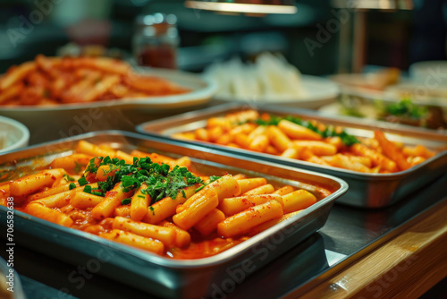 Korean cuisine, Tteokbokki in metal trays with greens.