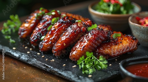 Korean Style Chicken Wings with Hot Sauce, Side View, Food Photography, Perfect for Food Advertising