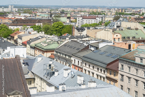 Krakow urban architecture. Aerial view of tenement houses in Cracow Old Town centre district in Kraków, Poland.