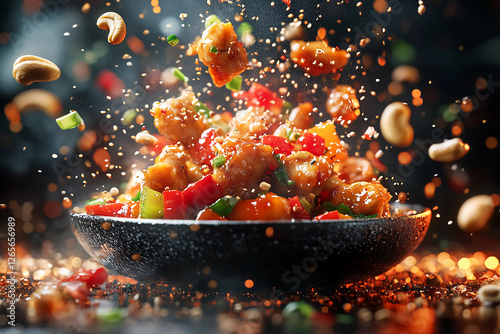Kung Pao Chicken with Vibrant Vegetables, Cashews, and Flying Ingredients in a Glossy Sauce, with a Blurred Background to Enhance Depth and Excitement