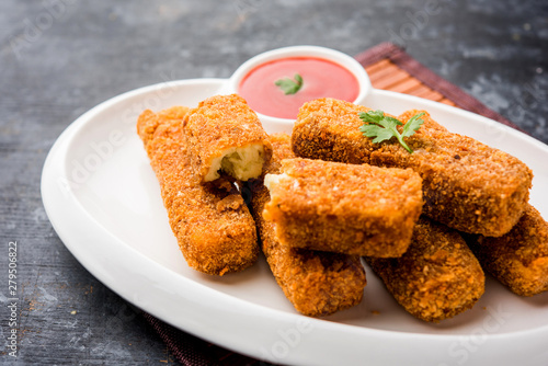 Kurkuri paneer fingers or pakora/pakoda snacks also known as Crispy Cottage Cheese Bars, served with tomato ketchup as a starter. selective focus