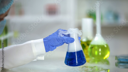 Lab assistant checking reaction in flask with blue substance emitting smoke