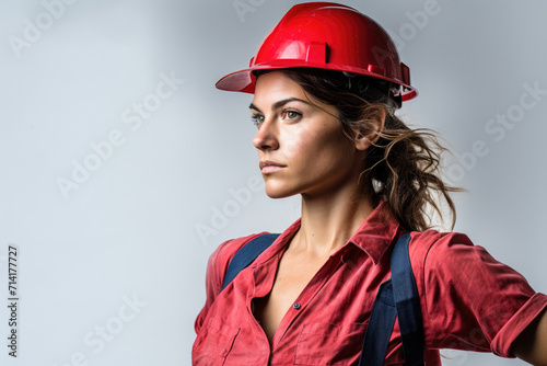 Labor day themed woman in safety helmet, isolated white background