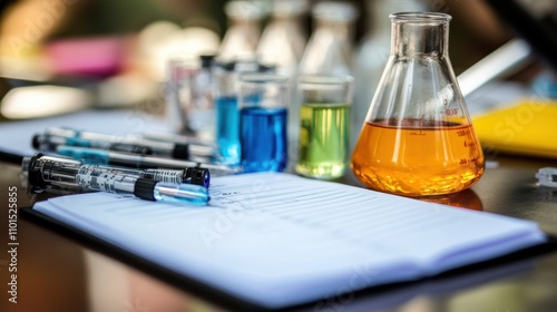 Laboratory Equipment with Colorful Liquids in Flasks and Test Tubes on a Table, Scientific Research and Experimentation Workspace with Notepad