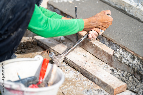 Labour in green long sleeve shirt using both hands to lever a wood with steel hammer inside a construction site.