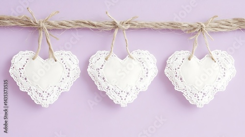 heart, lace, valentine, love, romantic, wedding, decoration, craft, hand-made, bricolage, twine, rope, string, hanging, purple, background, texture, pastel, delicate, feminine, vintage, design element, greeting card, invitation, scrapbook, celebration, anniversary, decor, home decor, art, baby shower, people, abstract, royalty free