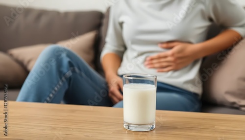 woman, table, abdominal pain, sofa, milk, lactose, intolerance, glasses, concept