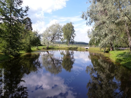 lake, water, mirror, landscape, nature, sky, summer, forest, tree, tree, green, blue, grass, park, spring, cloud, stream, outdoors, cloud, view, sunny, season