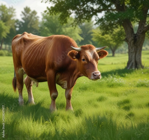 Landscape of a serene brown cow grazing in a peaceful green pasture, nature, green meadow