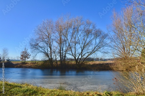 landscape of a winter frozen lake, the surface of the lake is covered with ice, blue sky, sunny day