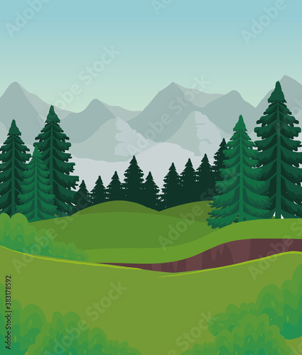 Landscape of pine trees in front of mountains design, nature and outdoor theme Vector illustration