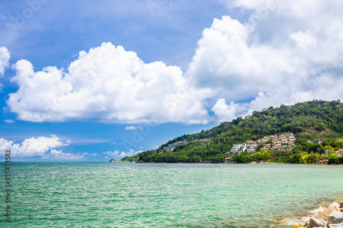 Landscape of the sea, the sky and the island with accommodation for relaxing on the island in Phuket, Thailand.