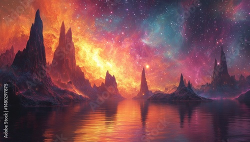 landscape, water, cosmic, sky, mountain, star, nebula, galaxy, colours, bright, orange, purple, blue, dark, light, surface, vibrant, surreal, aethereal, dreamy, fantasy, mystical, serene, peaceful, tranquil, quiet, huge, boundless, infinite, universe, cosmos, celestial, stellar, astral, gas, cloud, space, distant, horizon, glowing, shining, shimmering, vista, panoramic, scenic