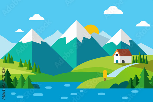landscape, house, village, sky, vector, illustration, tree, nature, summer, home, mountain, grass, cartoon, building, sun, spring, rural, mountain, farm, cloud, hill, forest, meadow, country, bungalow