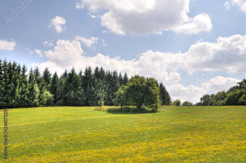 nature, protection, forest, flower, tree, tree, flower, meadow, cloud, daytime, pretty, warm, summer, sun, green, blue, heaven, fir, needle, spruce, pine, recreation, stroll, background, colours, yellow