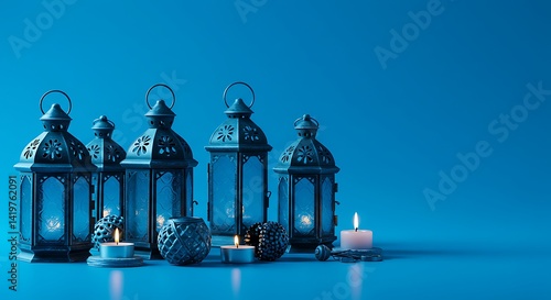 Lanterns and candles casting a soft glow against a solid blue backdrop in a studio setting