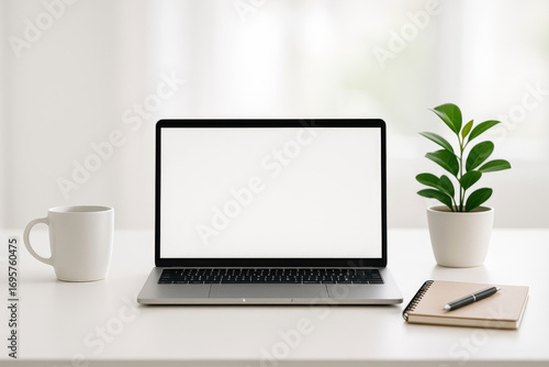 laptop, computer, desk, workspace, technology, blank screen, office, work, business, modern, clean, minimalist, coffee mug, drink, beverage, potted plants, greenery, home office, interior, indoor, table, white background, copy space, education, study, digital, communication, cyberspace, website, design, presentation, notebook, pen, stationery, productivity, sharpened, concentration, equipment, device, display, keyboard, touchpad, monitor, screen, object