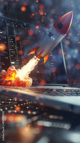 laptop with a rocket coming out of the screen, the rocket taking off from the laptop, in a 3d illustration