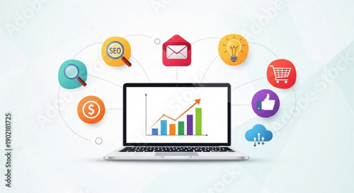 laptop, graph, business, marketing, finance, digital, technology, commerce, icon, computer, screen, online, datum, report, statistic, cyberspace, shopping, electronic mail, thumb up, like, share, money, dollar, search, engine, optimization, growth, success, progress, arrow, upward, trend, statistic, web, site, page, traffic, click, rate, increase, profit, businessman, workspace, office, colourful