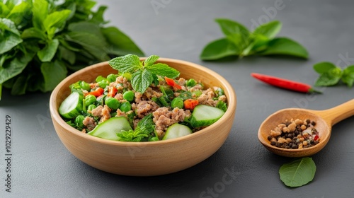 Larb salad, traditional Isaan dish, spicy Thai minced meat.