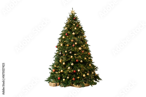 Large Christmas tree with mixed ornaments warm string lights golden star topper, isolated on a transparent background