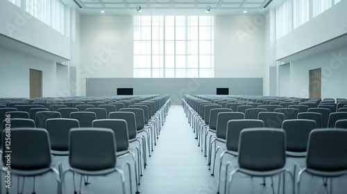 large, empty, conference, hall, row, chair, event, setup, meeting, business, corporate, seminar, presentation, roomy, professional, auditorium, modern, stage, lecture, workshop, gathering, organisation, formal, speaker, training, education, interior, venue, lighting, seating, convention, symposium, networking, discussion, exhibition, clean, minimal, elegant, preparation, arranged, audience, business meeting