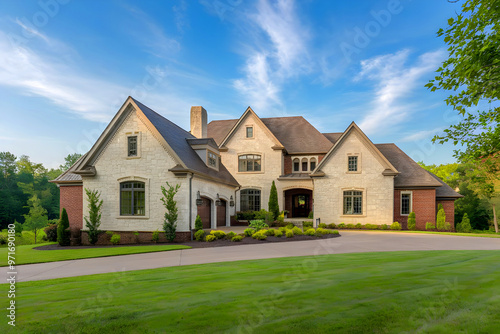 Large estate house with a multi-peak roof, windows, and a blue sky, exquisite landscaping, and a stone and brick facade.