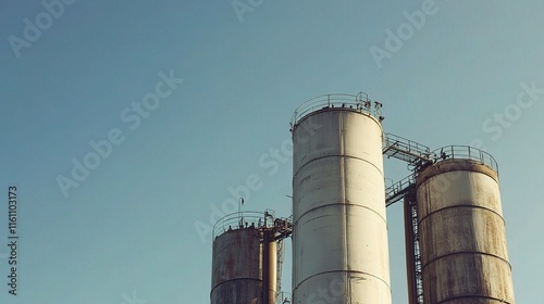 factory, silos, chimney, industrial, clear, blue, sky, architecture, metal, structure, perspective, environment, design, construction, engineering, large, height, concrete, urban, equipment, smoke, pollution, space, technology, mechanical, tall, background, scenic, panoramic, high, daylight, landscape, vertical, manufacturing, element, silhouette, age, texture, weathered, scene, industry, storage, round, facility, machinery, aerial, platform