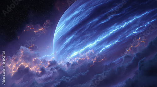 Large gas planet with lightning storms and vibrant blue clouds space, surrounded by dark starry sky and glowing nebulae