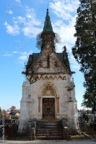 large, highly, decorated, carved, stone, family, tomb, strong, wooden, door, locked, metal, padlock, surrounded, rusted, fence, tall, tree, cloudy, blue, sky, background