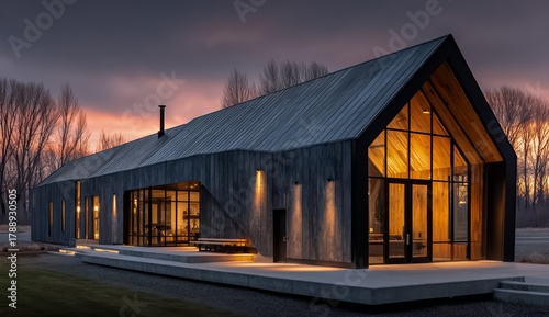 Large house with a lot of windows and a fireplace. The house is surrounded by trees and has a warm