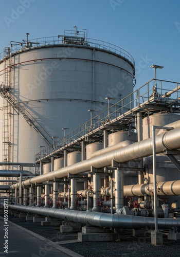 Large industrial storage tanks and complex piping systems used for storing and distributing essential natural energy resources globally, usage, industrial, utility
