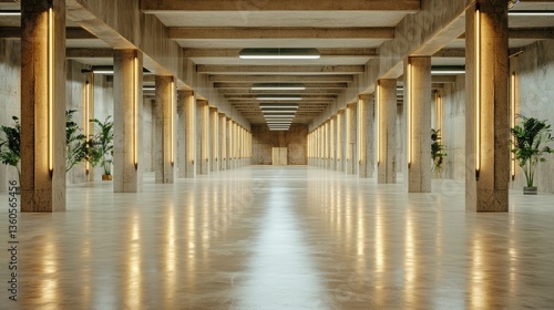 Large minimalistic parking basement with smooth concrete floors and dramatic lighting.