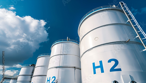 Large storage tanks with H2 and HYDROGEN labels on a blue sky background