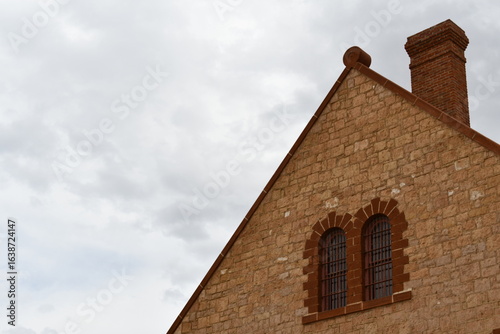 Large vintage prison made of stone. High roof pitch, red brick chimney. Barred windows.