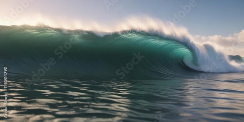 Large wave with crests breaking at the horizon, light bronze colors, sunset