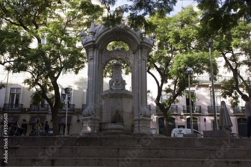 Largo do Carmo fountain in Lisbon, in front of the ruins of the convent, surrounded by trees