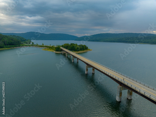Late afternoon summer aerial photo of the bridge over the Cannonsville Reservoir, Trout Creek, Route 10.