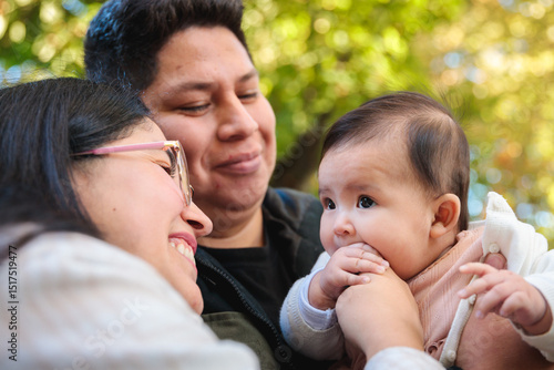 Latin couple holding their baby daughter outdoors