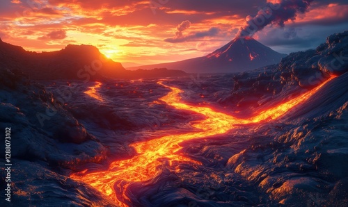 Lava Flow at Sunset with Erupting Volcano in Background Creating Dramatic Landscape