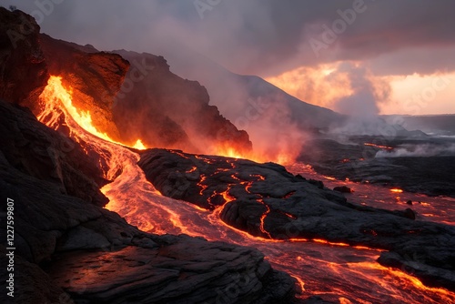 Lava Flow Erupting from Volcano at Dusk